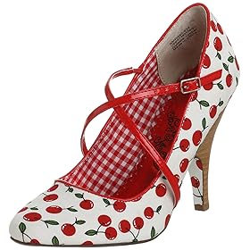 A cool burst of fun-flavored style Cherry-print fabric upper Cushioned footbed 3-1/2" stacked heel Adjustable buckle closure